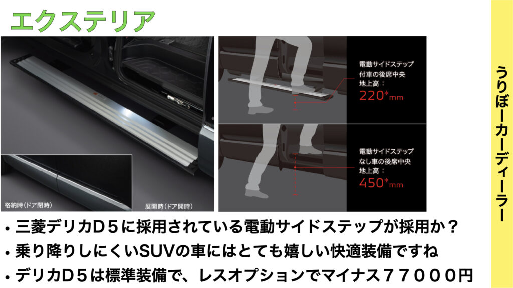 三菱のデリカD5に搭載されているような電動サイドステップが採用されるようですね。