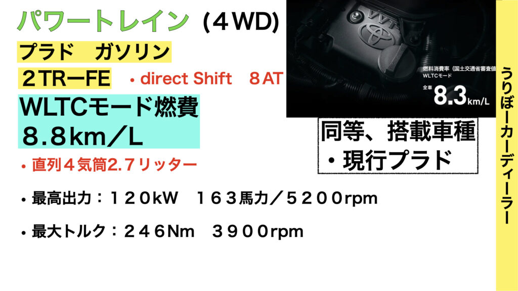エンジンはガソリン2.7Lとディーゼル2.8Lの2種類あり、差額はおおよそ60万円です。