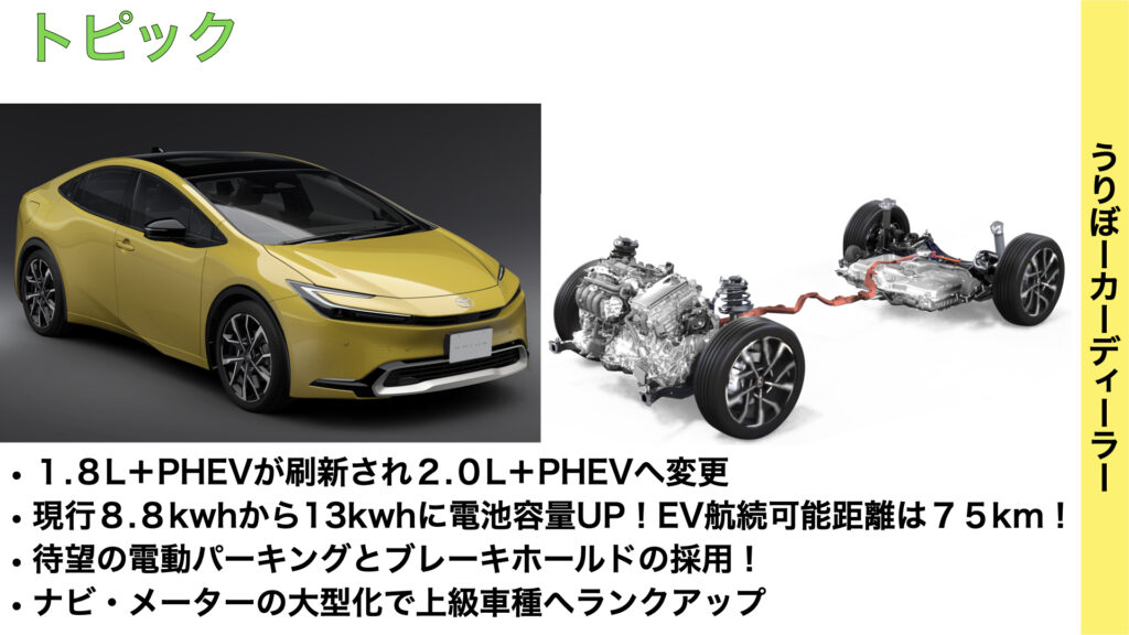 バッテリー容量もUPし航続距離UP。プリウスと同じく電動パーキング&ブレーキホールドが採用されます。現行PHEVは縦型の大型ナビゲーションが採用されていましたが新型では横型になりますね。