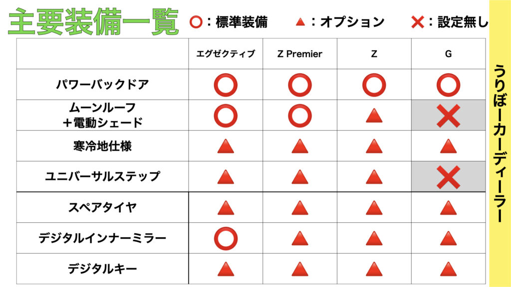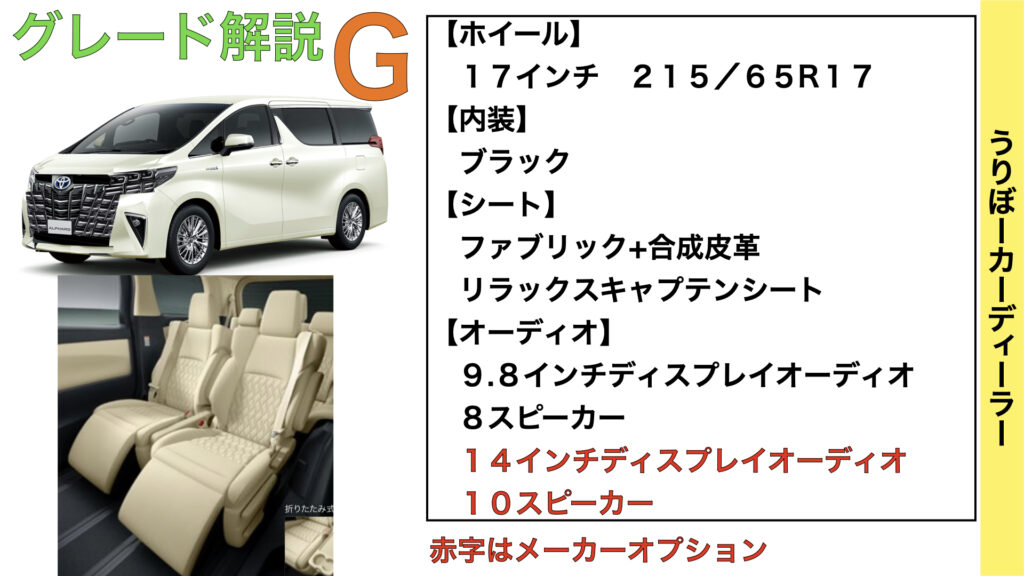 さすがエグゼクティブラウンジはほとんどが標準設定です。対して下位Gグレードはほとんどの設定がありません。