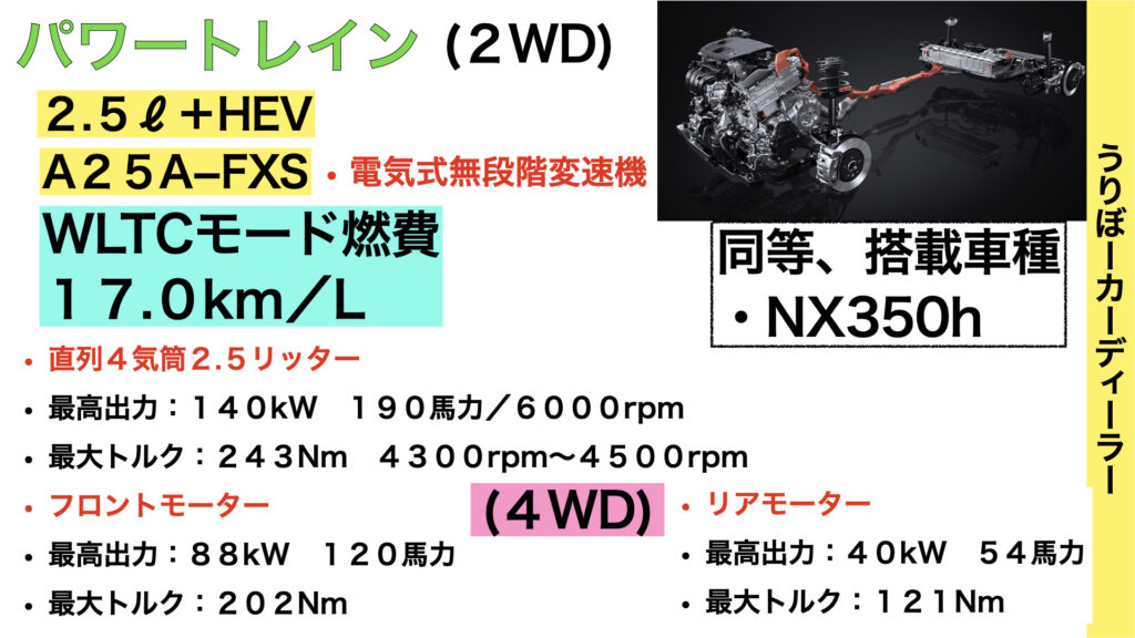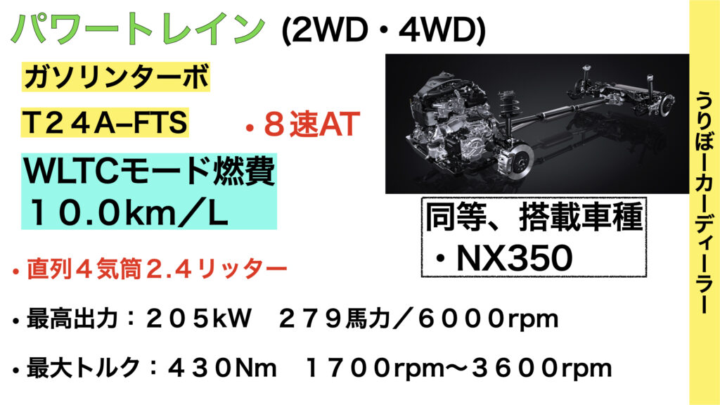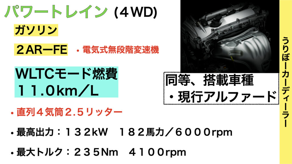 現行NXに積んでいるエンジンですね。グレード解説でちらっと書きましたが2.4Lターボはヴェルファイアにのみ設定され2.5Lガソリンは設定なし。若干のパワーダウンはありますが3.5Lから維持費も安くなり、燃費も改善されいいかもしれませんね!