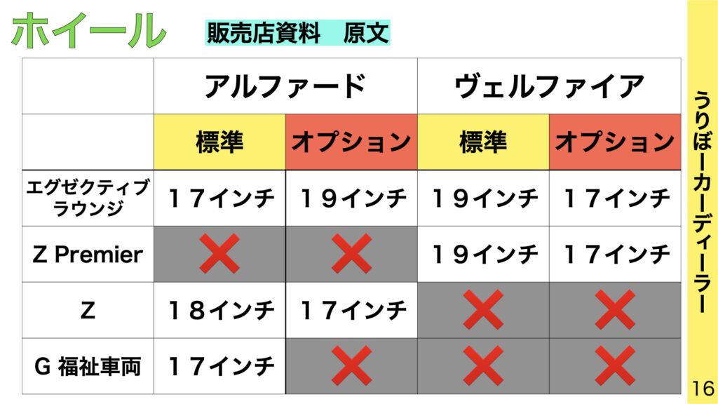 メーカーオプションといえばインチアップのイメージが強いですがアルヴェルでは面白い構成をしています。アルファードではインチアップが基本、ヴェルファイアではインチダウンの設定になっています。