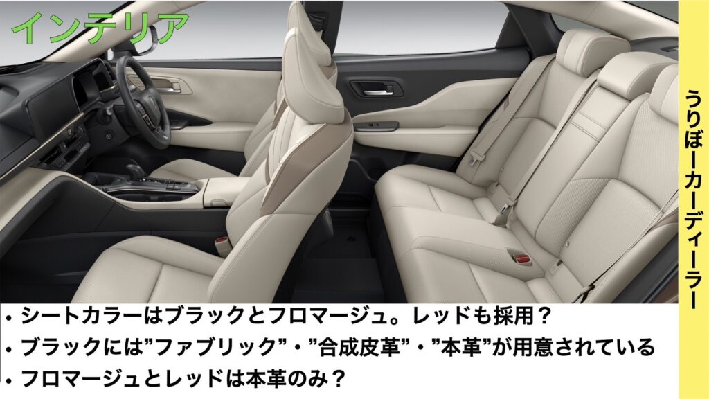 内装色はブラック、フロマージュに加えてスポーティ感のあるレッドも採用されそうです。ハリアーのブラウンともまた違った雰囲気になりそうですよね!また合成皮革の設定も追加されお買い求めやすくなりそうです。
