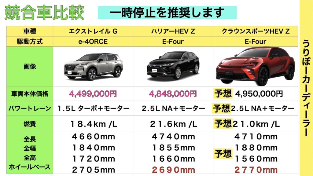 他メーカーで比較されるであろう車種代表でエクストレイルもあげています。パワートレインの違いや車格の差はありますが価格差は大きいです。SUVラインナップも各メーカー充実してきていてどの車種を選ぶか迷ってしまいますよね。