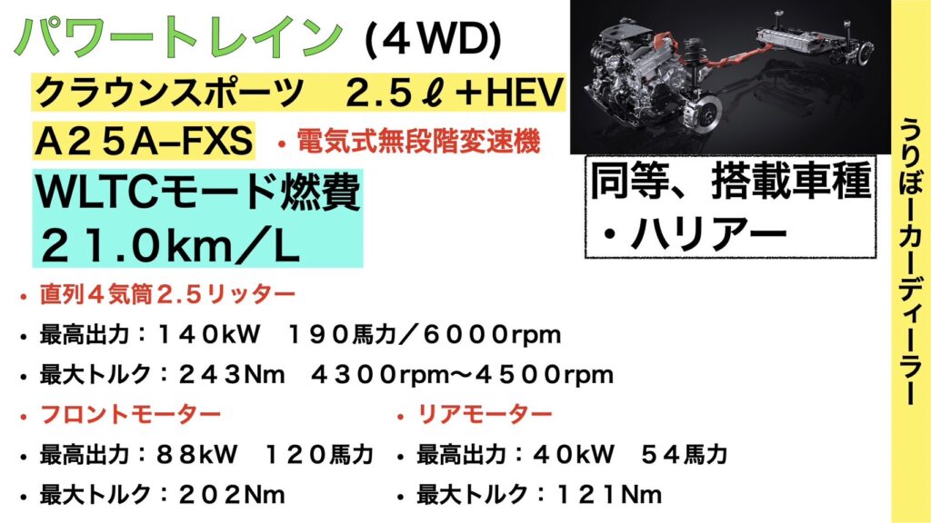 PHEVはハリアーやRAV4同様のシステムを使うだろうと予想されます。300馬力越えの走りに期待が持てますね!この2つのパワートレインは既販車にて採用されているものですので下記で紹介いたします。