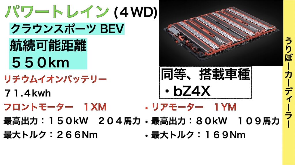 現在トヨタ唯一のBEV、bZ4Xにて搭載されているバッテリー等を採用予定です。bZ4Xより車格は上に設定されると思いますので価格も上がりそうです……